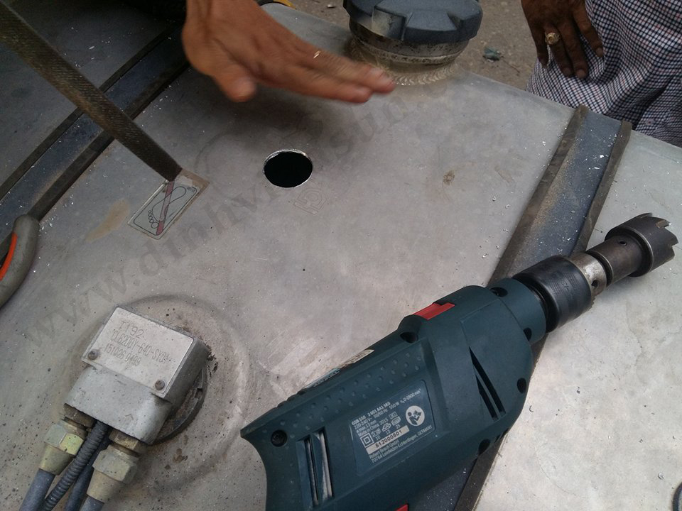 Lưu ý : Tại điểm này việc khoan và lấy miếng kim loại ra phải cẩn thận trong từng thao tác để tránh mạt sắt, mạt kim loại lọt vào thùng dầu ảnh hưởng đến hệ thống xe khi hút nhiên liệu sử dụng, vận hành.