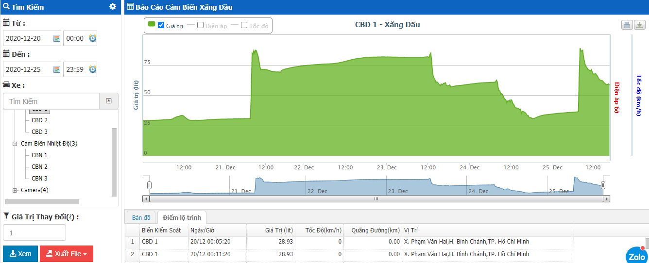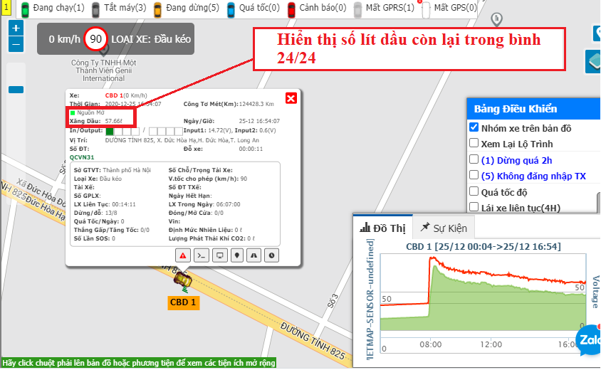 Báo cáo số lít dầu có trong bình tại mọi thời điểm và xem dữ liệu mới nhất được cập nhật trong hệ thống quản lý đội xe.