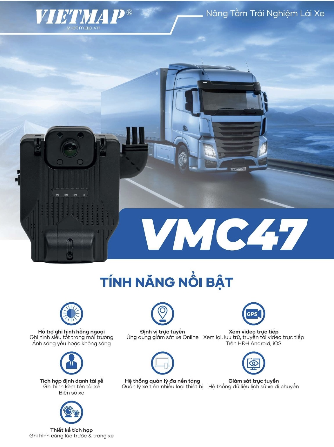 VIETMAP VMC47 - Giải pháp trực tuyến quản lý từ xa chuyên dụng dành riêng cho loại hình kinh doanh dịch vụ vận tải được tích hợp nhiều tính năng nổi bật: Ghi hình cùng lúc Trước & Trong xe rõ nét toàn cảnh, Lưu trữ hình ảnh, tự động truyền dữ liệu về tổng cục đường bộ, Hệ thống VIETMAP quản lý xe giám sát trực tuyến, tích hợp định danh tài xế. Đặc biệt, khi xe di chuyển vào khu vực không có sóng VIETMAP VMC47 vẫn tiếp tục ghi hình, tự động sao lưu khi có sóng 3G/4G thiết bị sẽ chuyển song song cả dữ liệu bị thiếu và dữ liệu hiện tại lên tổng cục.
