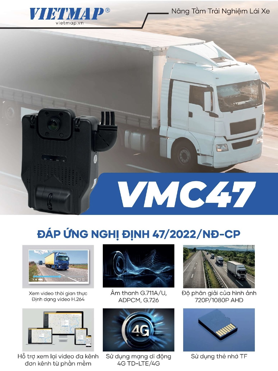 VIETMAP VMC47 là camera giám sát hành trình trực tuyến quản lý từ xa, đáp ứng tiêu chuẩn kỹ thuật, phù hợp yêu cầu Nghị định 47/2022/NĐ-CP. Giúp doanh nghiệp giám sát phương tiện giao thông hiệu quả, tối ưu chi phí quản lý, cắt giảm rủi ro, hỗ trợ nâng cao niềm tin giữa doanh nghiệp và khách hàng.