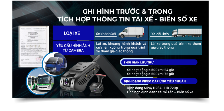 - Tích hợp định danh tài xế, Ghi hình kèm tên tài xế; biển số xe
