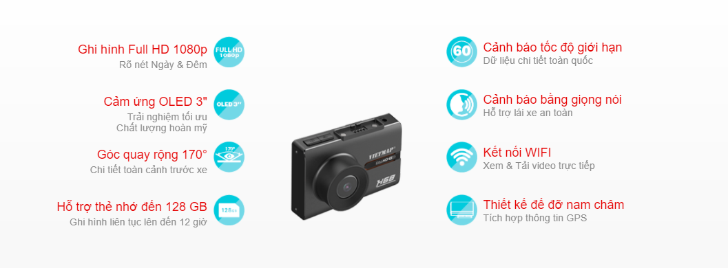 Camera hành trình VIETMAP H68 với ống kính ghi hình góc rộng, chất lượng Full HD 1080p giúp ghi lại toàn cảnh trước xe kết hợp màn hình cảm ứng 3" tấm nền OLED mang lại trải nghiệm hình ảnh chân thực.