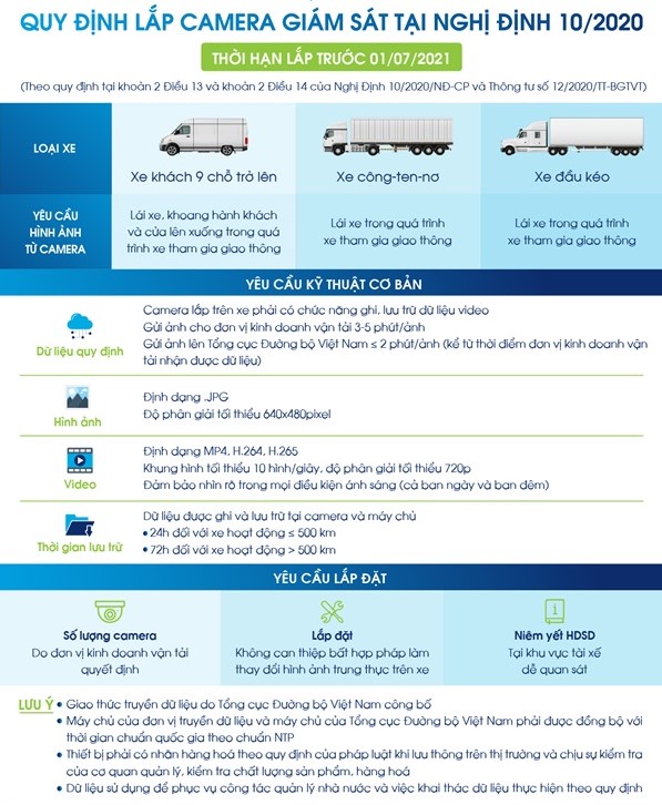 Trước ngày 01 tháng 7 năm 2021, xe ô tô kinh doanh vận tải hàng hoá bằng công-ten-nơ, xe đầu kéo phải lắp camera đảm bảo ghi, lưu trữ hình ảnh của người lái xe trong quá trình xe tham gia giao thông. Dữ liệu hình ảnh được cung cấp cho cơ quan Công an, Thanh tra giao thông và cơ quan cấp giấy phép, bảo đảm giám sát công khai, minh bạch. Thời gian lưu trữ hình ảnh trên xe đảm bảo như sau: