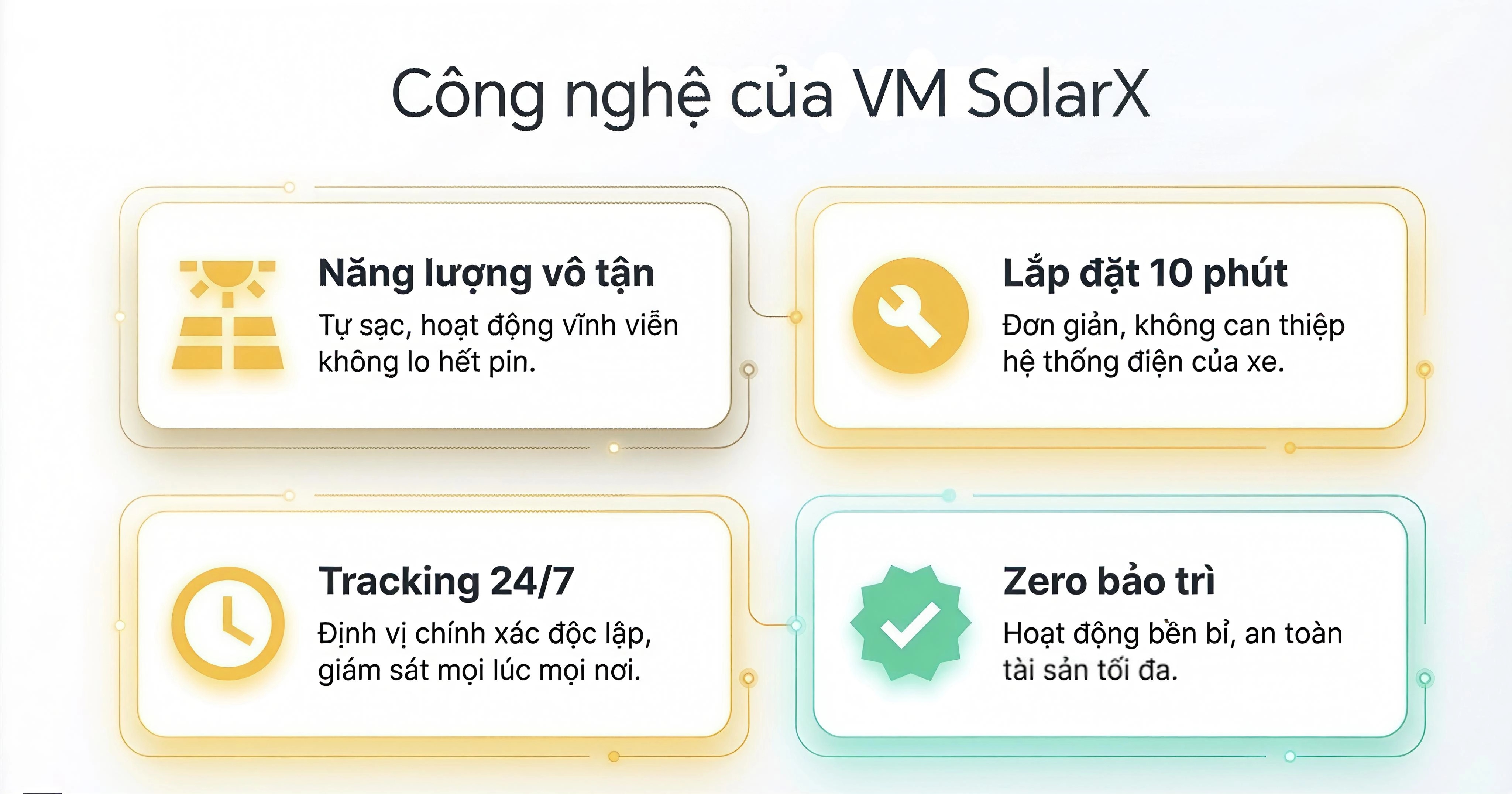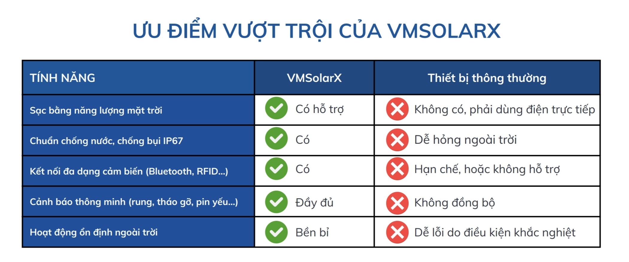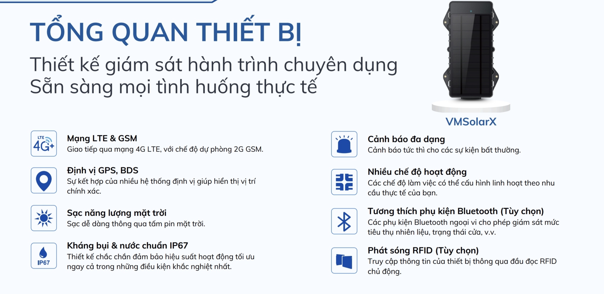 Thiết bị Giám sát hành trình Năng lượng mặt trời VMSolarX là thiết bị định vị thông minh sử dụng năng lượng mặt trời với khả năng kết nối 4G LTE, được thiết kế chuyên biệt cho việc quản lý phương tiện xây dựng và tàu thuyền.